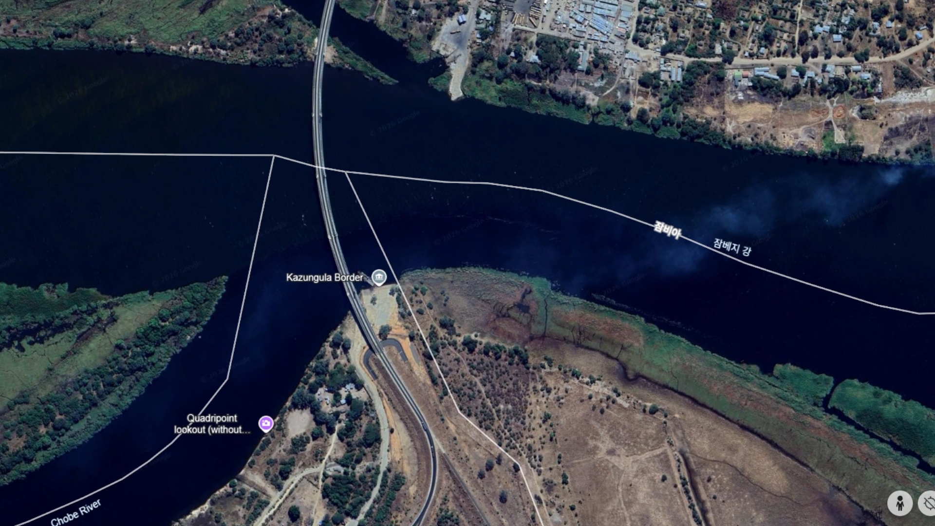이 좁은 회랑이 쐐기처럼 박혀 있는 탓에, 바로 위에 있는 앙골라와 아래에 있는 보츠와나는 국경을 맞대지 못하게 되었습니다. 지도상으로 보면 강을 사이에 두고 국경선들이 복잡하게 얽혀 있는 모습이 매우 인상적입니다.