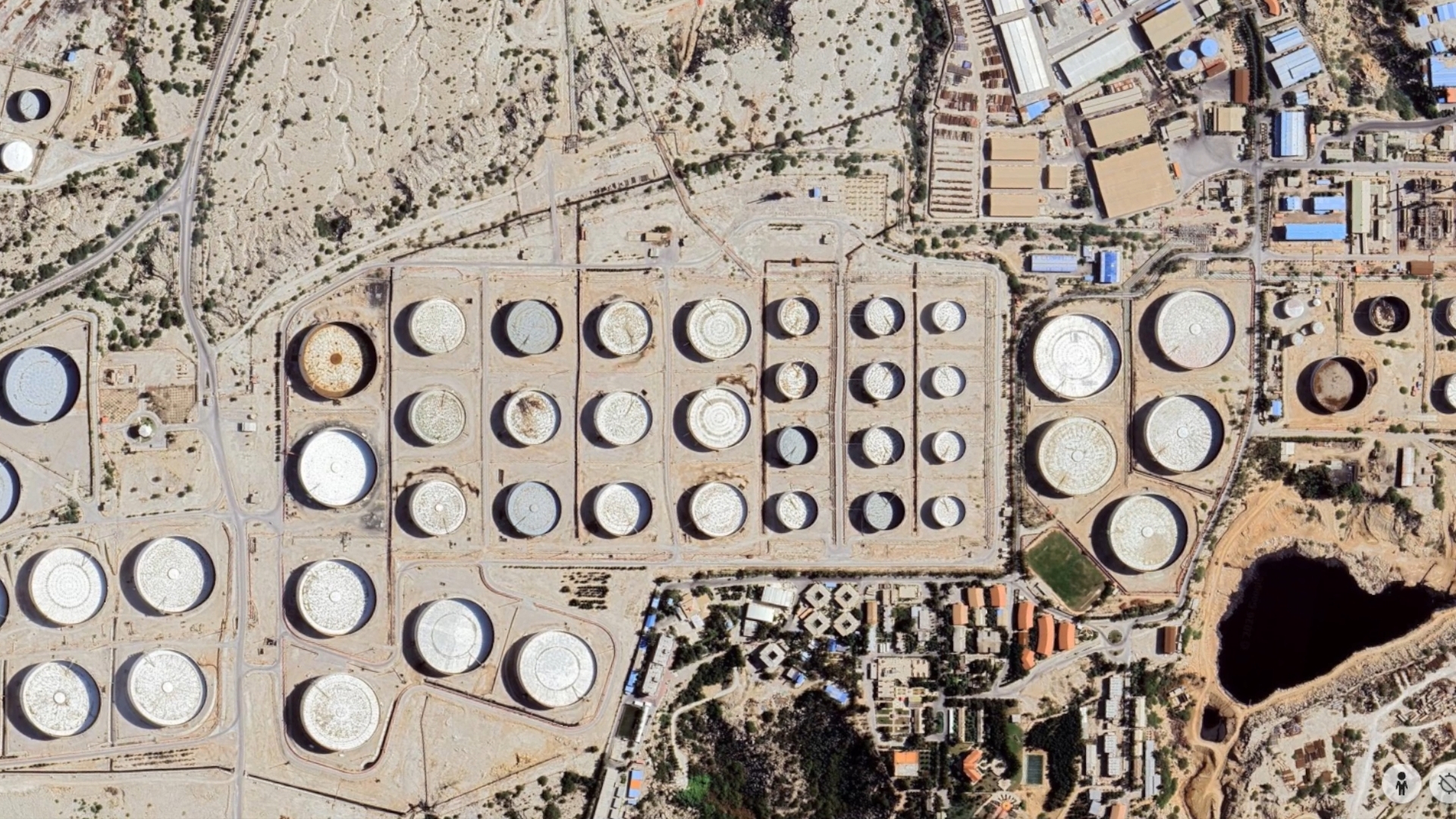 섬 전체가 거대한 원유 저장 탱크들로 빽빽하게 채워져 있으며,
