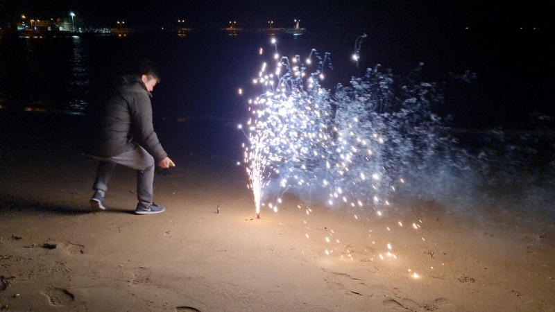 바닷가에서 불꽃놀이를 하는 사람들을 보면