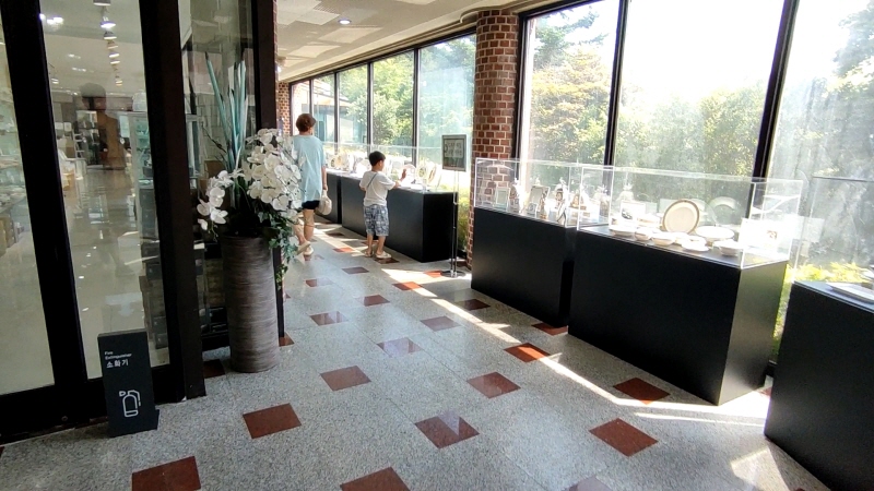 로비에 이렇게 그릇들이 전시되어 있어요!
