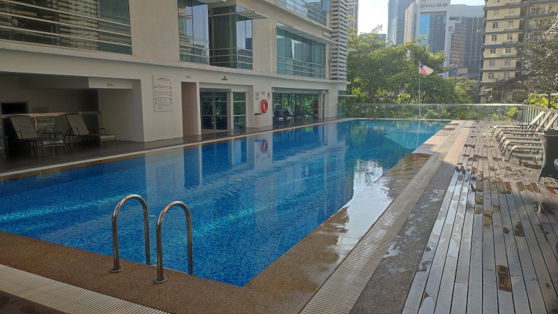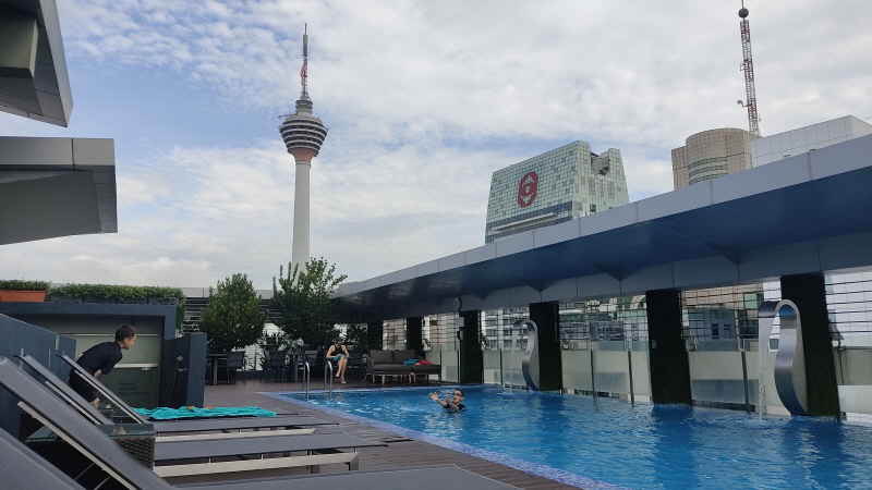 조식에 대해 너무 혹평을 한 것 같은데 가격을 생각하면 뭐 어느정도 납득이 되기도 합니다😄 파크로얄 서비스스위트는 수영장이 두군데나 있는데요. 아래 사진은 G층에 있는 수영장이에요! 높은 층은 아니지만 KL타워도 보이고 분위기가 괜찮았어요!