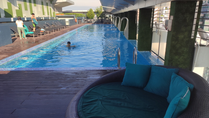 파크로얄 서비스스위트의 하이라이트라 할 수 있는 루프탑 스카이풀이에요! 쿠알라룸푸르의 높은 마천루들을 조망할 수 있는 멋진 곳이었어요🌇 수영장이 크진 않지만 사람도 별로 없더라구요~